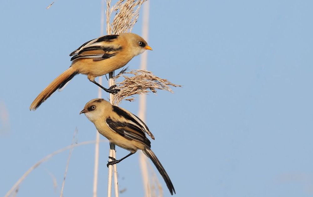 Een tiental onvolwassen baardmannetjes is aan het foerageren in het riet