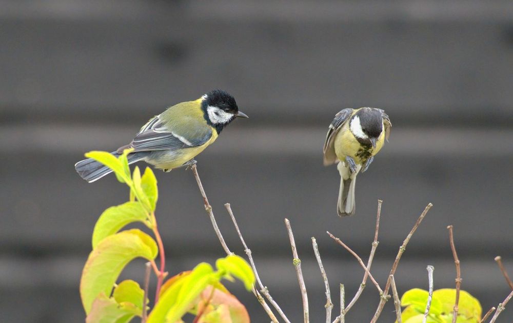 Dit koolmezenpaartje had een nestje gemaakt in het nestkastje tegen de gevel van onze achterburen. Heel leuk om te volgen en de interactie te zien tussen man en vrouw. Hier kijkt het mannetje toe hoe het vrouwtje naast hem neerstrijkt.