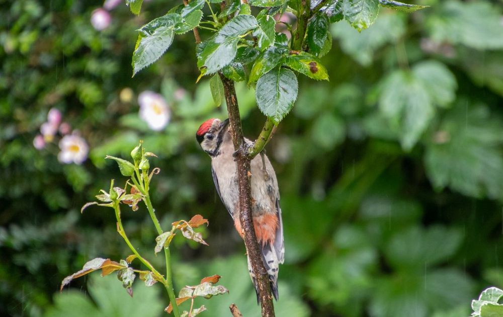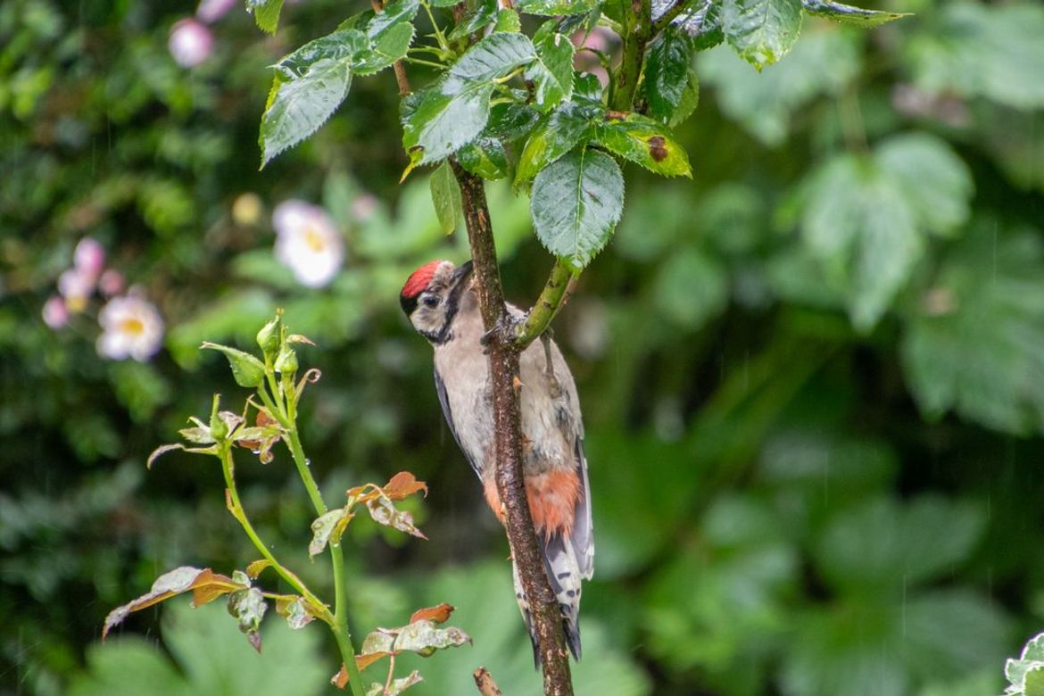 De jonge specht zat in de roos die vlakbij de pindasilo staat.