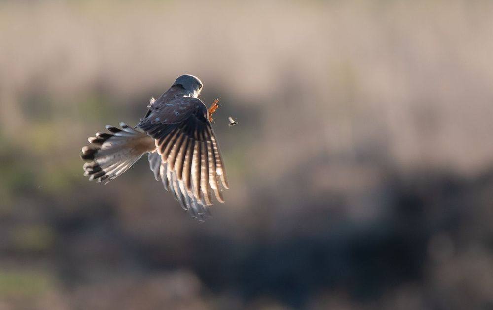 Deze torenvalk was op jacht en greep zo een aantal bijen uit de lucht.