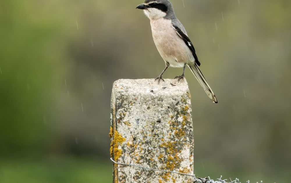Al hou ik van close-ups, deze foto van de Iberische klapekster vind ik ook wel mooi: wat meer omgeving, je ziet dat het regent, de hele vogel goed in beeld.