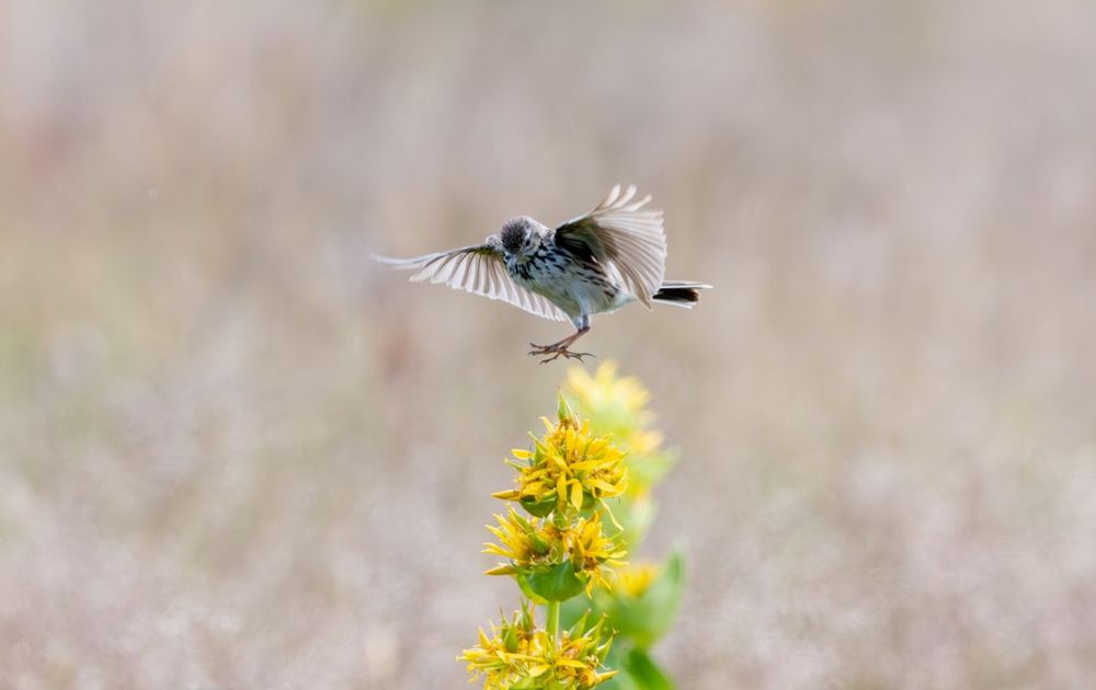 Op de Ballon d'Alsace heb ik deze foto genomen. De graspieper zat op een bloem boven het hoge gras. Vloog weg naar een volgend uitkijkpunt(bloem) en ik heb hem toen kunnen fotograferen.