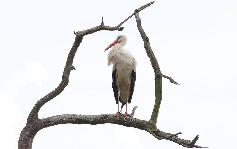 Deze dode eikenboom is al jaren een geliefde plek voor allerlei vogels. Deze ooievaar is er 1 van de 4 die in de boom zaten. Bij het inzoomen werd een geringde poot zichtbaar.
