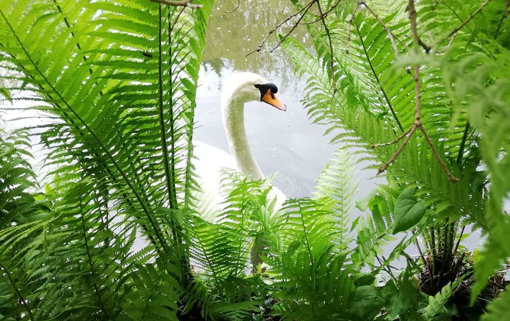 We waren bezig om de woekerende winde tussen de varens uit te trekken. Ineens verscheen deze prachtige zwaan om te zien wat we aan het doen waren.