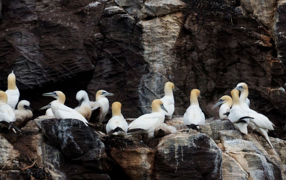 Op de Bass Rock in Schotland, ten oosten van Edinburgh, eilandje in zee, zetelt de grootste kolonie van Noordelijke Jan-van-Genten ter wereld. Ze broeden hier hun eieren uit en brengen hun jongen groot. De jongen hier zijn nog pluizig en hebben een zwarte snavel.