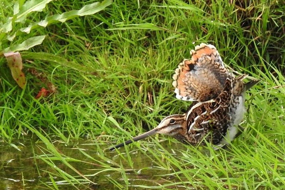 Bijzonder moment dit . Watersnip die regelmatig in alarmstand springt . Dit mede omdat er steeds een heli over het gebied komt.