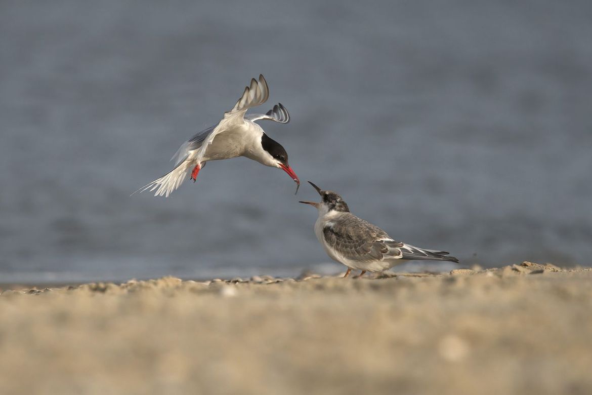 Iedere avond in de vakantie een rondje over de Volharding op Texel. Mijn aandacht werd getrokken door een bedelende juveniel van de Noordse Steren. Op respectabele avond ben ik er bij gaan liggen. Om het kwartier kwam papa of mama met een visje aanvliegen.