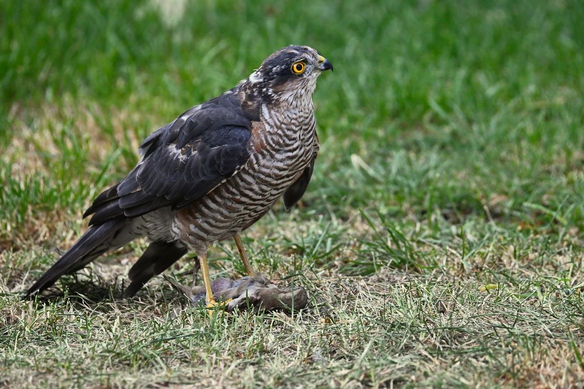 Sperwer met heeft een mus gevangen en vliegt ermee weg.