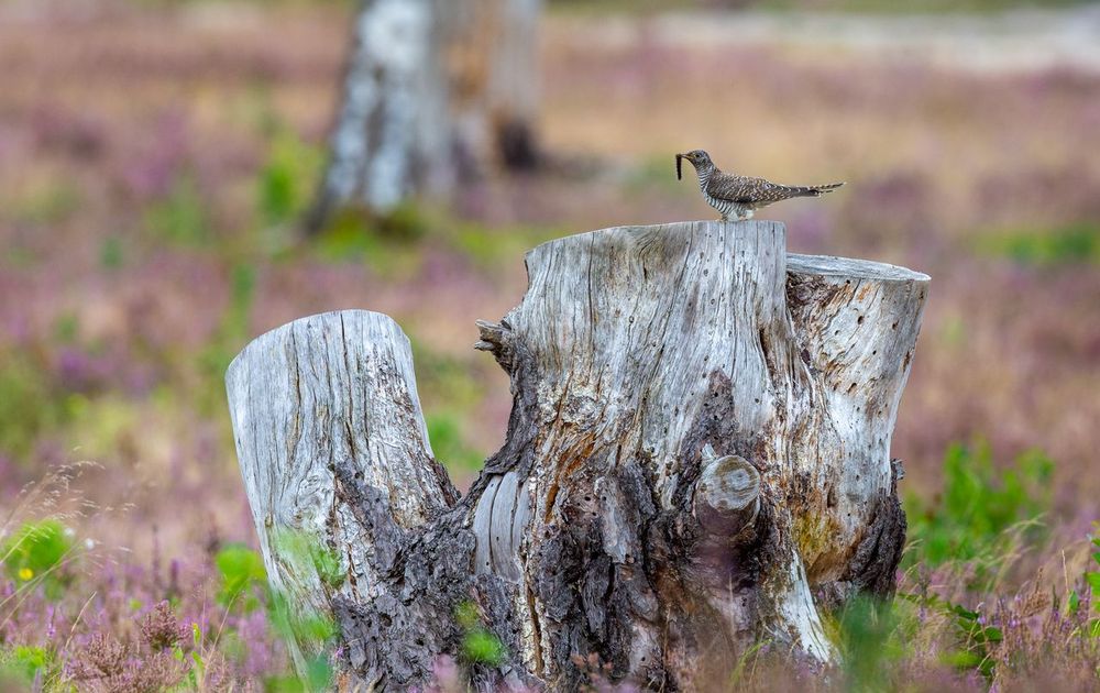 Mooie contrasten van heide, dode boomstam en een jonge koekoek die een rups snaait.