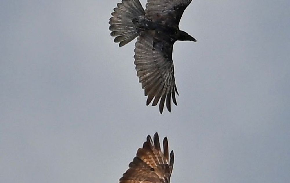 Ze bleven vrij lang rond elkaar heen draaien. Uiteindelijk ging de kraai er vandoor.