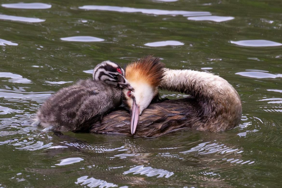 Dit lijkt een liefdevol plaatje, maar ouder fuut had helemaal geen zin in jongen op zijn rug...Dat waren doorzettertjes, dus uiteindelijk zaten ze met z'n tweeën op de rug. Mooi schouwspel.