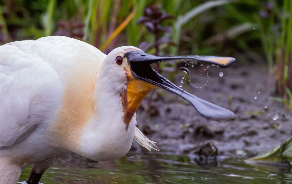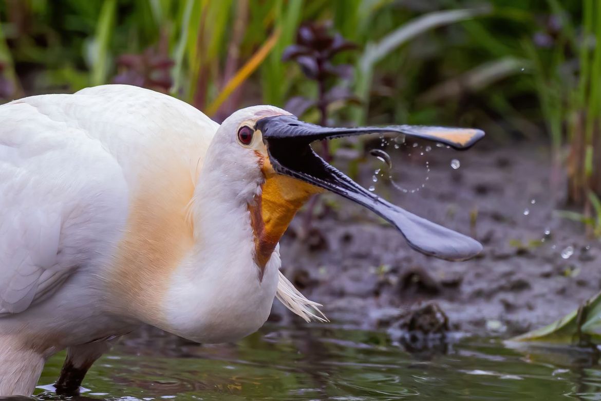Deze Lepelaar heeft een visje te pakken en gooit het omhoog om hem te kunnen inslikken.