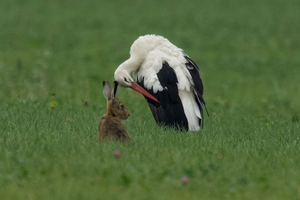 Soms loop je tegen wonderbaarlijke situaties aan. De ooievaar en haas bleven zo'n 5 minuten samen, elkaar aankijkend alsof ze een koppel waren. Daarna ging ieder kalm zijns weegs. Het was een gelegenheid voor een mooie serie foto's, goed voor een cartoon!
