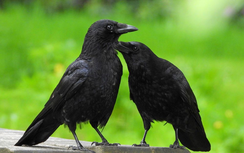 Op een picknicktafel zijn 2 zwarte kraaien neergestreken. De ene verzorgt de veren van de andere waar die zelf met de snavel niet bij kan komen.