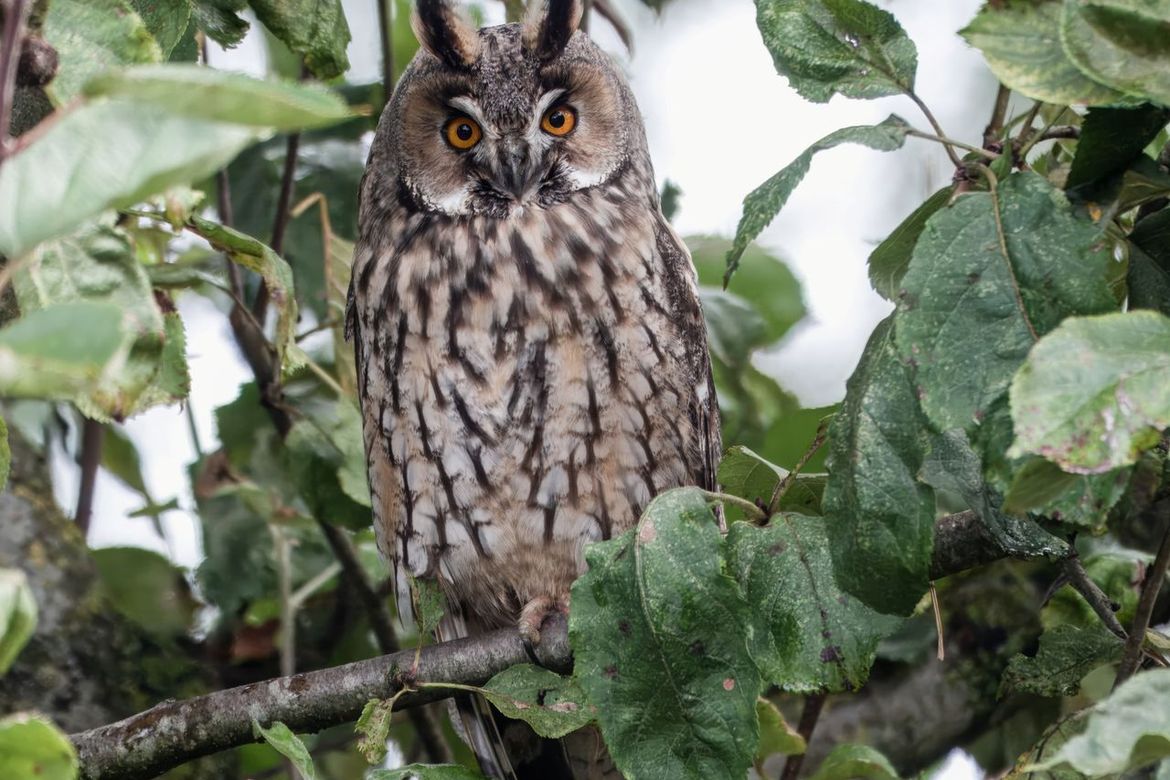 Gisteren ontdekte ik een ransuil in onze appelboom. Hij vloog weg, schrok van mij. Vanmorgen op gepaste afstand weer gekeken of de ransuil teruggekomen is. Gisteravond in de schemering zag ik 'm nog vliegen dus ik had goede hoop. En ja hoor, daar zit hij weer in de appelboom! Rouveen, 27 september 2025