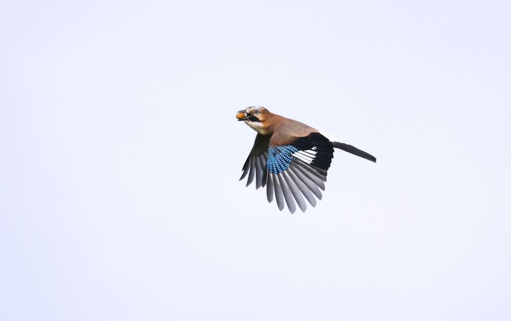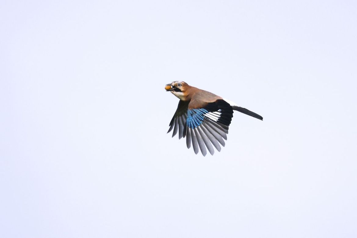 Opeens vloog er een vliegen eikel voorbij. Snel de camera gericht (1/2000s, 800mm, f9) om deze overvliegende gaai met een eikel in zijn bek als buit te fotograferen. Hoewel het licht niet optimaal was (zwaar bewolkt) komen de prachtige kleuren van deze slimme vogel mooi tot zijn recht!