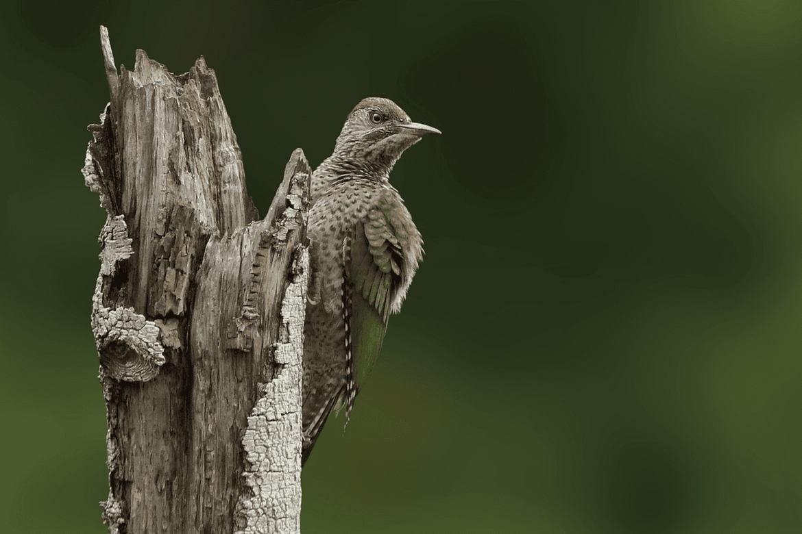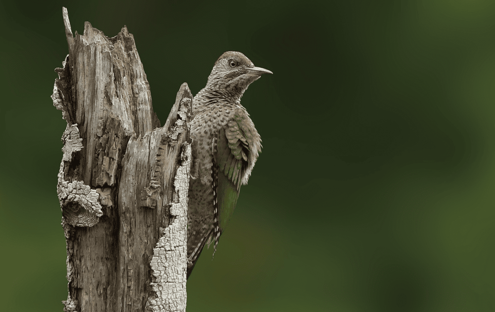 Deze foto is genomen vanuit een fotohut. We hoorden hem al eerder, opeens zat hij een stuk verderop in het gras in een smalle doorgang tussen de bossages. Kwam steeds iets dichterbij om uiteindelijk op deze dode stam de omgeving te verkennen.
