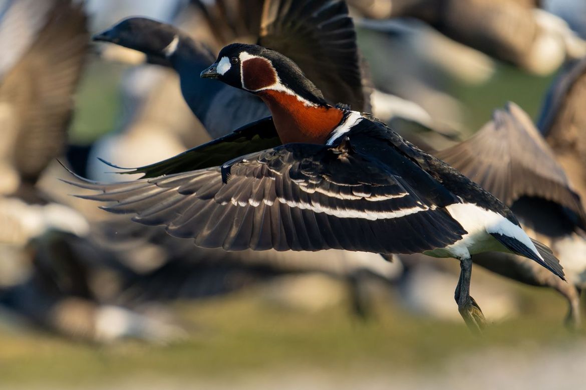 Deze roodhalsgans zat voor in een groep brandganzen en rotganzen, mooi in het avondlicht. Ze liepen bij een rustig fietspad en ik kon de roodhalsgans langdurig erg mooi bekijken. Helaas kwam op een gegeven moment iemand aan fietsen en vloog de hele groep op, maar daardoor kon ik wel deze foto maken.