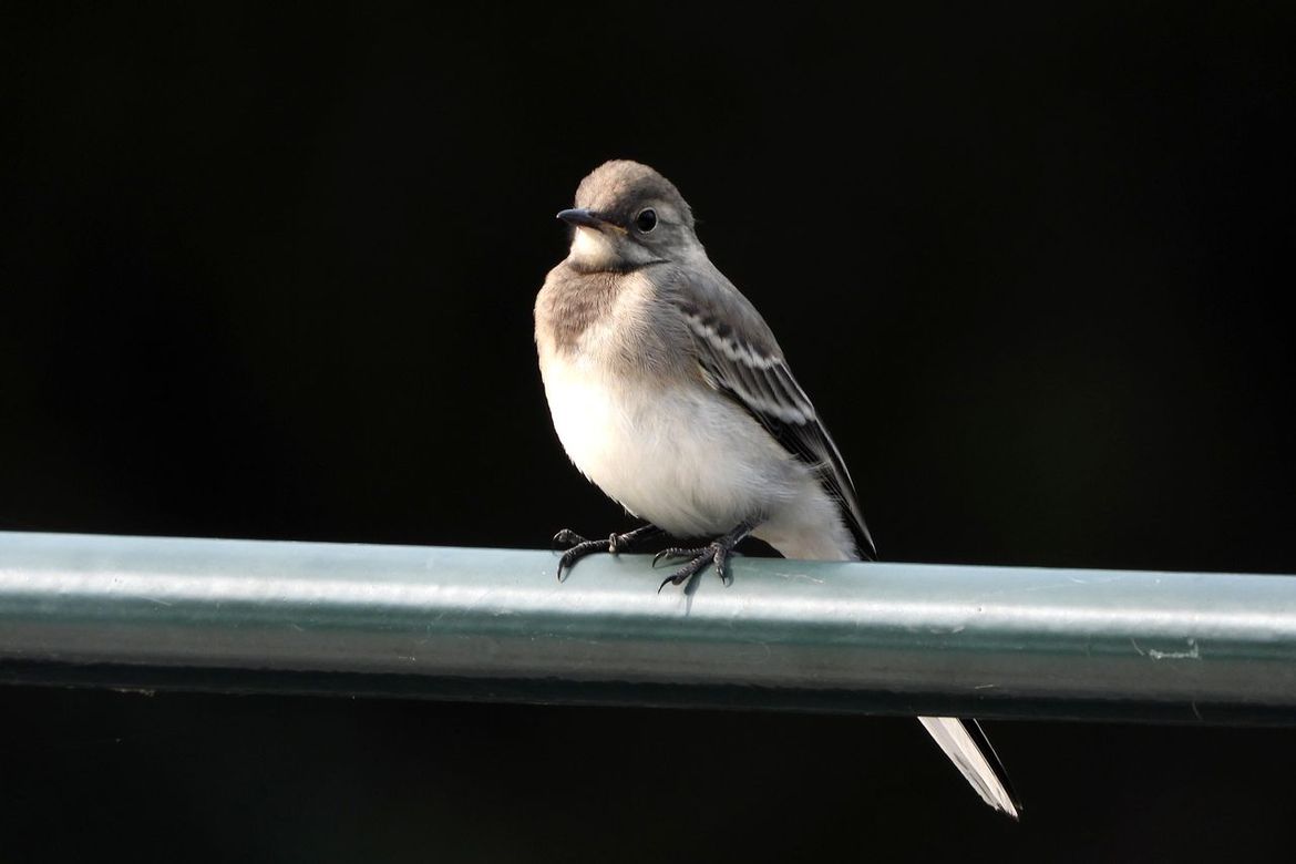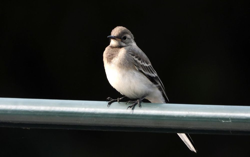 Een jonge kwikstaart is neergestreken op het hek langs de bosvijver.
