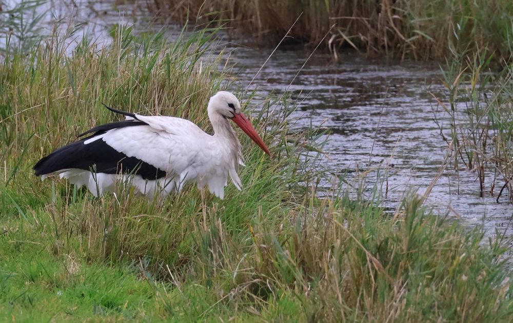 Ik trof een hele groep van 15 ooievaars in het weiland. Waarschijnlijk een verzamelplaats om samen richting het zuiden te vertrekken, want een paar dagen later waren ze weg en meer mensen vertelden dat ze er elk jaar zitten. Deze ooievaar was zich rustig aan het voorbereiden op de reis.