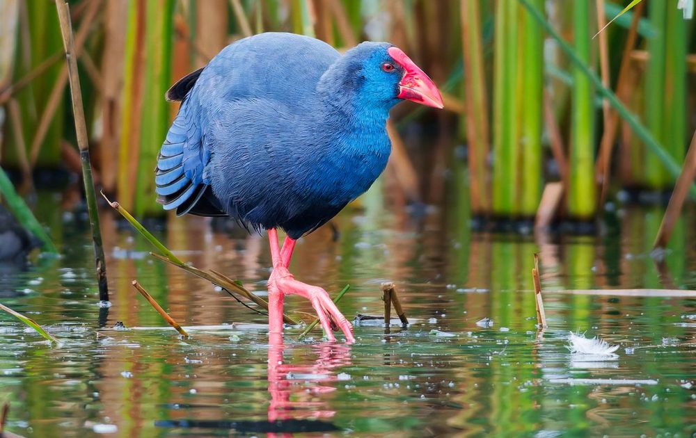 Nu ik hem gezien heb, vind ik hem meer blauw dan paars. Deze Purperkoet zit al sinds de zomer in de Eendragtspolder bij Zevenhuizen. Hij was eerst zijn aan het veren poetsen en daarna druk in de weer met rietstengels. Een mooie vogel!