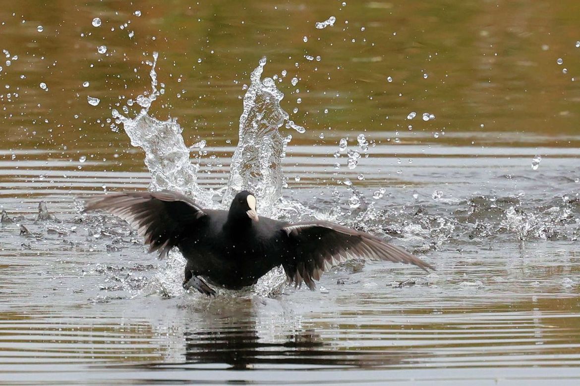 Wegwezen De meerkoeten zijn dominant in de sloot en jagen de futen en eenden uit de buurt. Totdat er een Aalscholver in de sloot zat en opeens boven kwam. De Meerkoet maakte dat hij weg kwam.