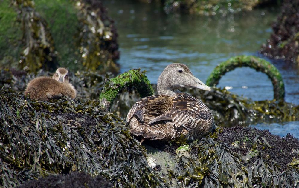 Deze Eidereend (vrouw) met haar pulletje ligt lekker op de keien op te drogen