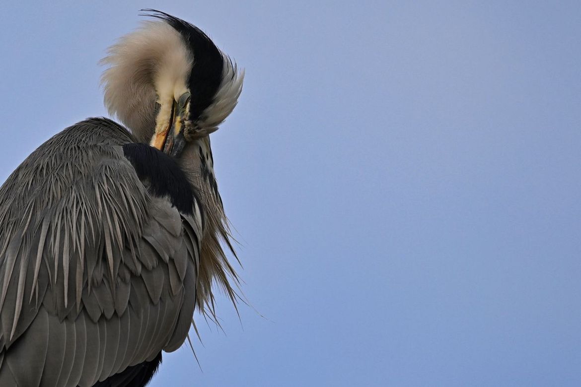 De Blauwe Reiger zat in onze straat op het dak sierlijk zijn/haar veren te verzorgen.