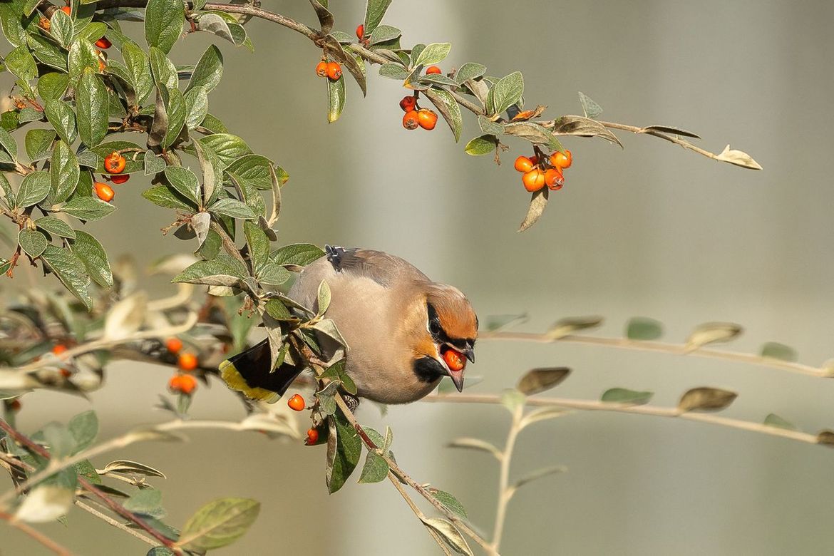 Een aantal pestvogels waren aan het foerageren in bessenstruiken. Ze vlogen van de ene naar de andere struik. Ik ben op een boomstam gaan zitten...hopend dat ze op de struik dichtbij mij zouden komen. Wat een mazzel....dat deden ze...héél even maar. Maar genoeg om een paar foto's te nemen.