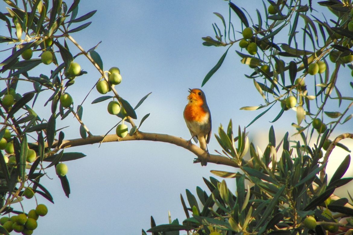 Ik hou erg van vogels en fotografeer ze graag, dit roodborstje zat een poosje in een druivenstruik te zingen, maar kwam toen vlak voor me in een olijfboom zitten, ik was dolblij toen ik deze foto kon maken, mijn dag kon niet meer stuk!
