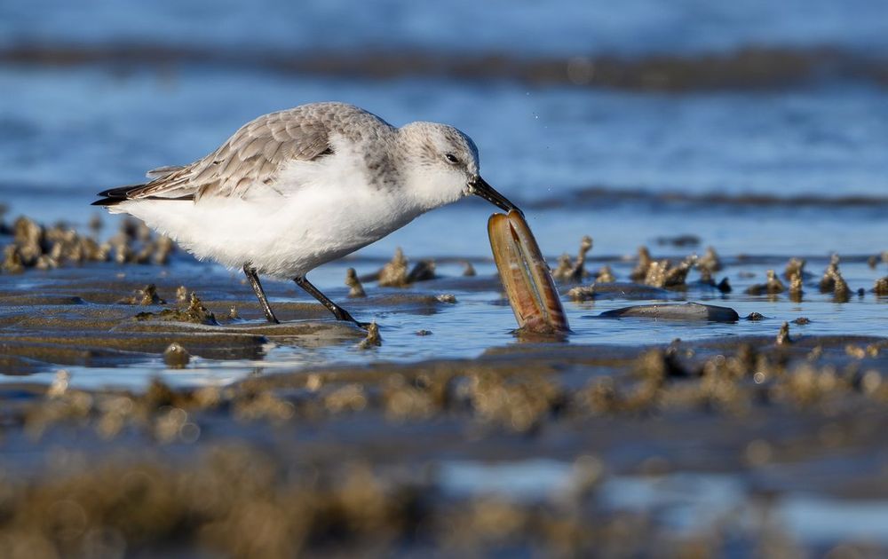 Deze drieteenstrandloper probeerde met alle macht dit scheermes open te wrikken, wat uiteindelijk lukte. Alles voor het voedsel! Met windkracht 6-7 was het een uitdaging om dit in beeld te brengen. De foto is op gepaste afstand genomen (met een 600mm PF), achteraf flink gecropt.