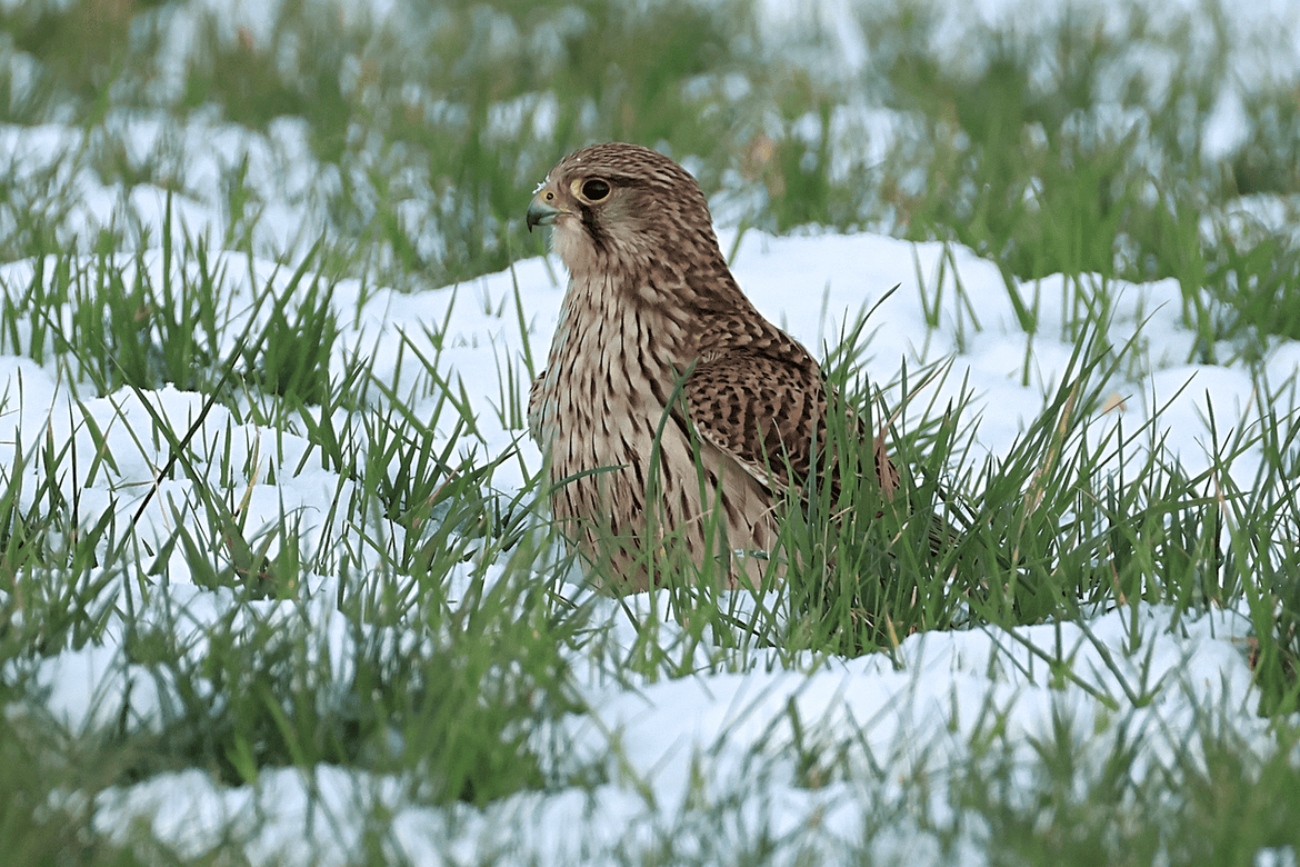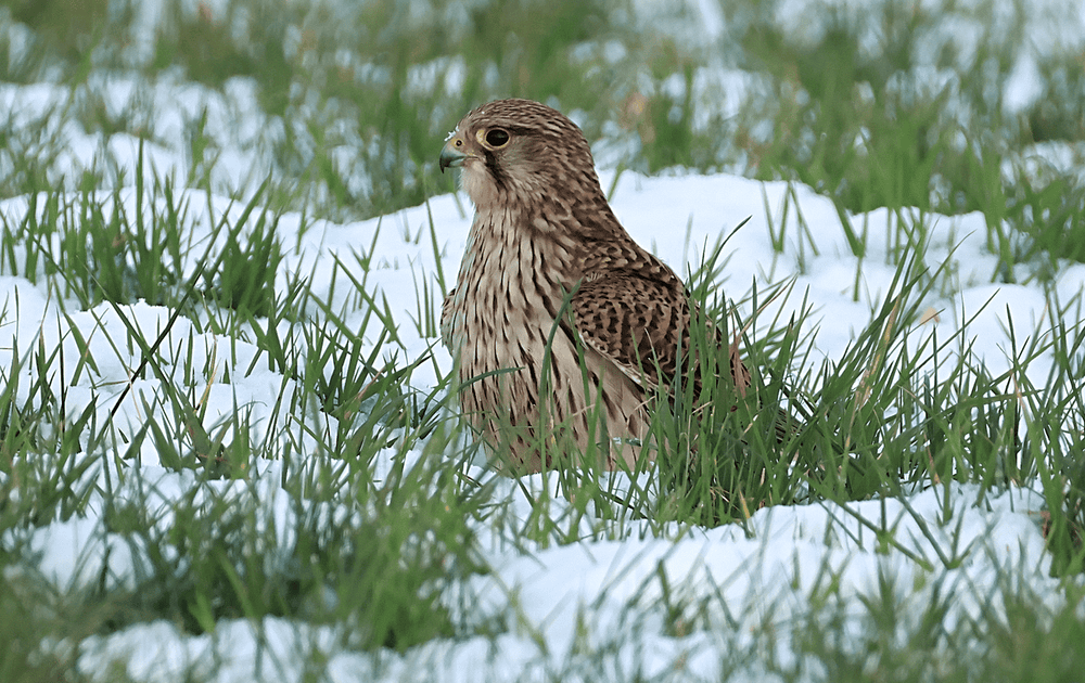 Een torenvalk in de sneeuw een prachtig winters schouwspel.
