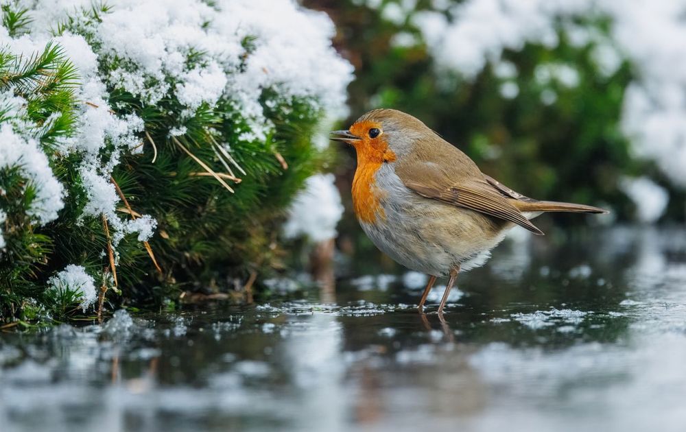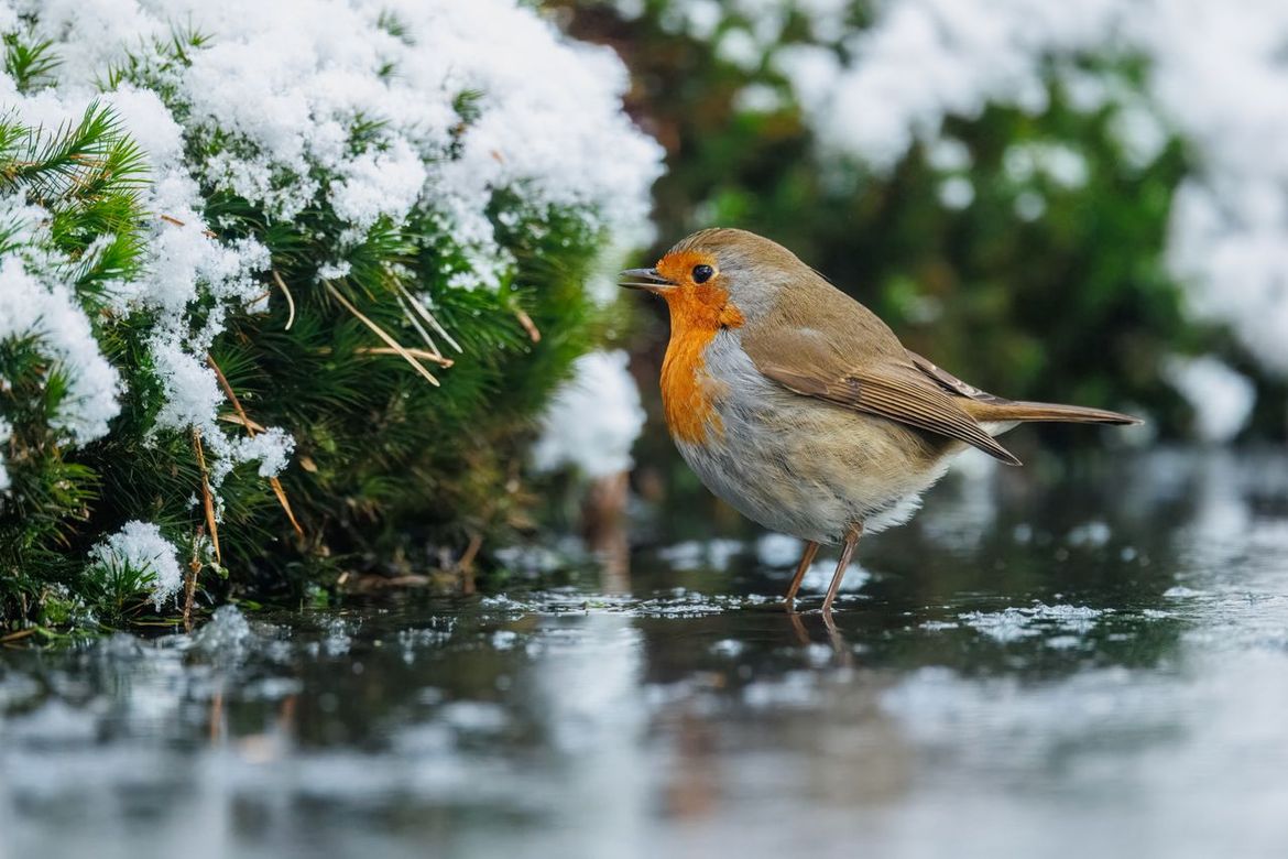 Roodborstje in winterse omstandigheden, blijft de fotogeniekste vogel in de sneeuw