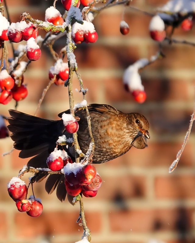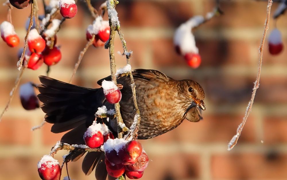 Voor de merels is het sierfruit om van te smullen in de koude winterdagen.