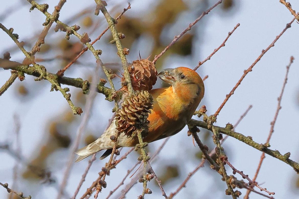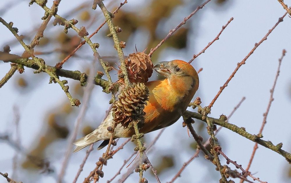 groep kruisbekken waren aan het genieten van de zaden van de lariks boom