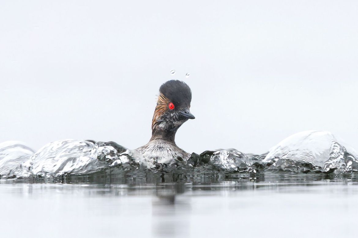 Drie geoorde futen waren elkaar aan het belagen en verdwenen alle drie onder water. Even later kwam deze met veel waterverplaatsing boven water. Door een redelijke lange sluitertijd 1/640 sec heeft het water net nog beweging. Als bonus twee waterdruppels vlak boven de kop. In 2025 winnende foto van jaar Natuurfotografen Vereniging Utrecht.