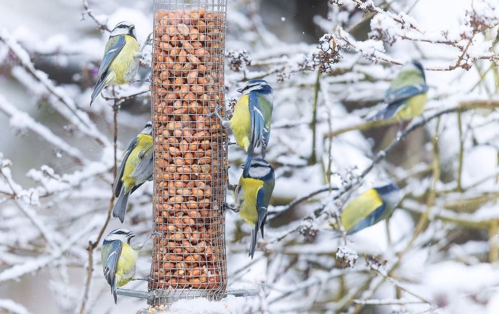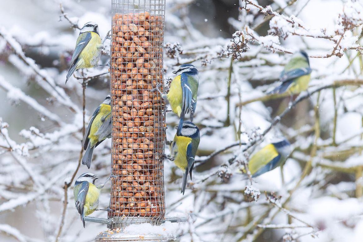 Een groep Pimpelmezen geeft een kleurrijk geheel in een besneeuwde omgeving