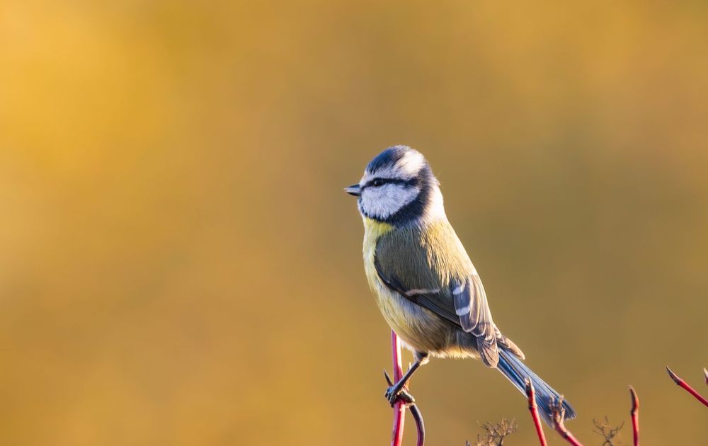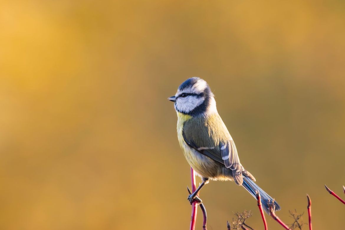 Pimpelmees zat op de takken van de kornoelje in mijn tuin tijdens het gouden uurtje
