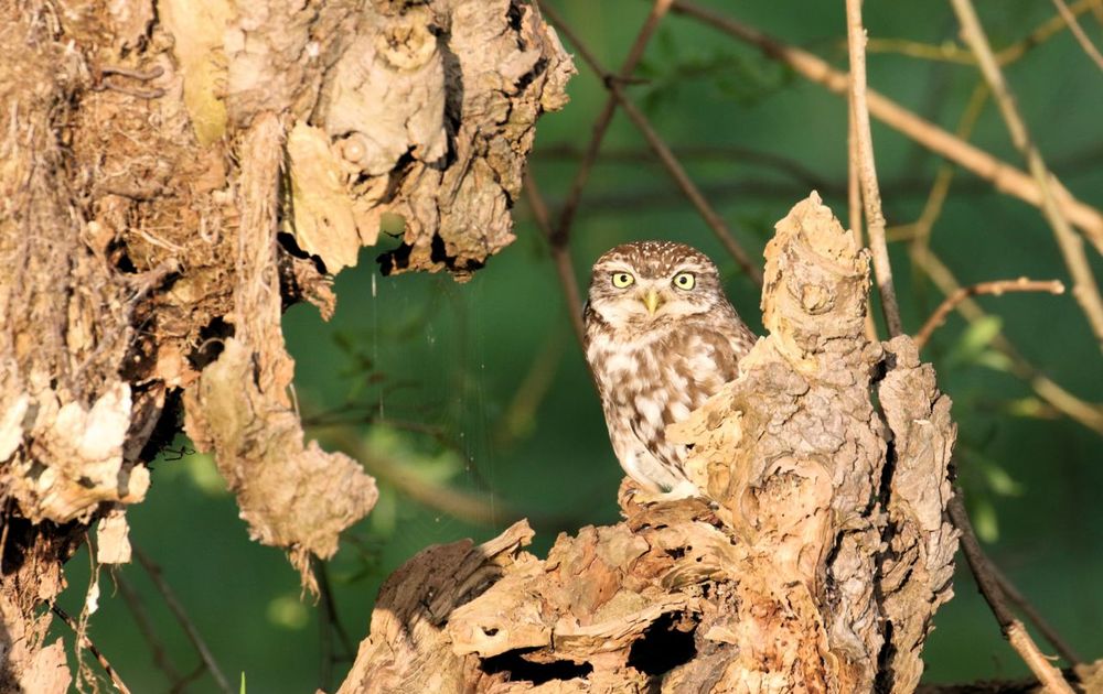 Steenuil geniet in een oude knotwilg van de avondzon