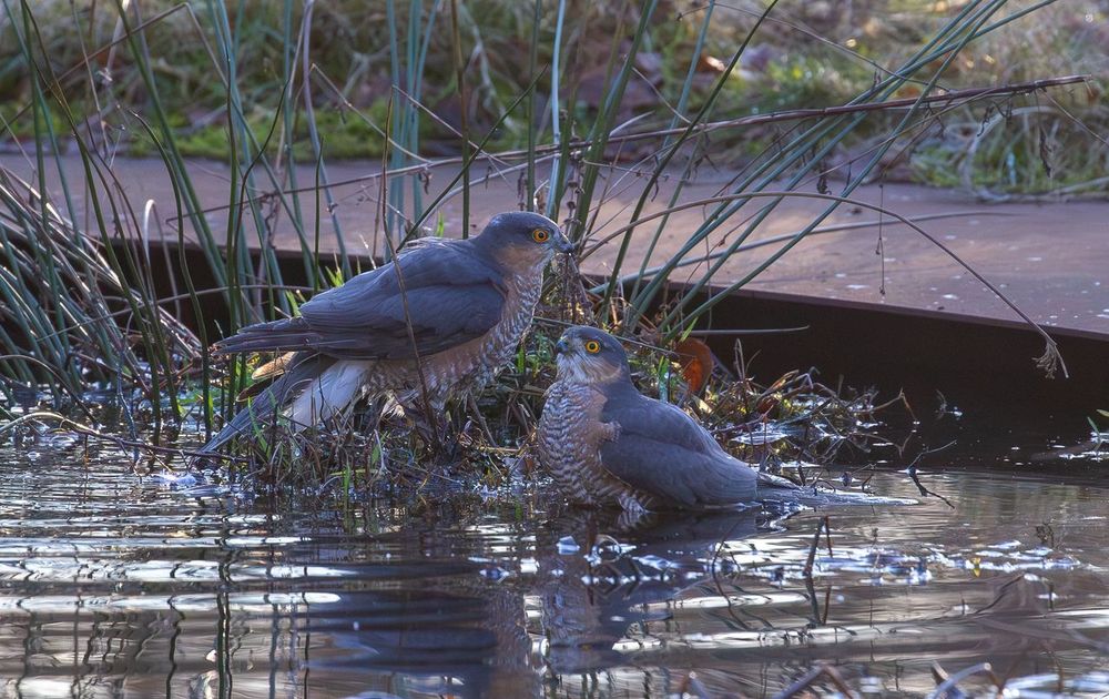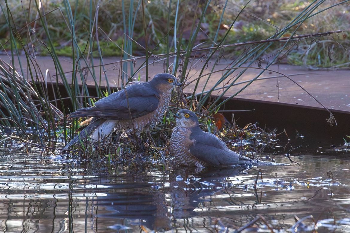 Twee sperwermannetjes gebroederlijk en vriendelijk aan het badderen in de vijver. Ik wist niet wat ik zag! En nog steeds niet: trekken sperwermannetjes vaker met elkaar op?