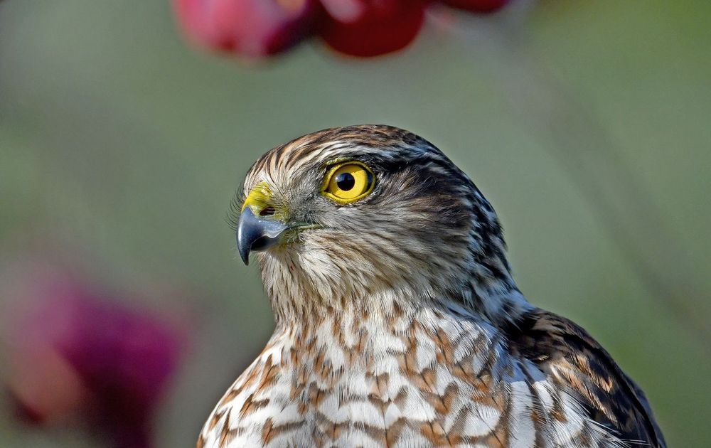 vrouw sperwer zat in sierappelboom in onze tuin.Ik kon haar voorzichtig benaderen tot 5 meter,ze bleef gewoon zitten.