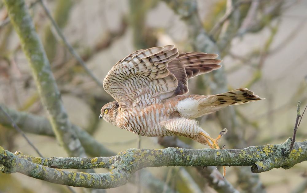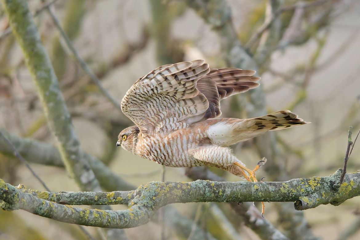 De Sperwer vloog weg van de tak waarop hij zat, waardoor het prachtige patroon op de buik en onderkant van de vleugels goed zichtbaar was.