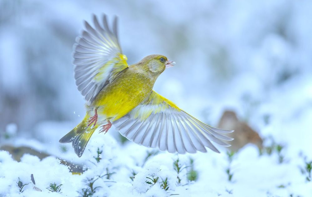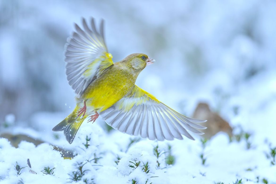 Een groenling schiet op uit de sneeuw en laat zich zo mooi van de onderzijde zien.