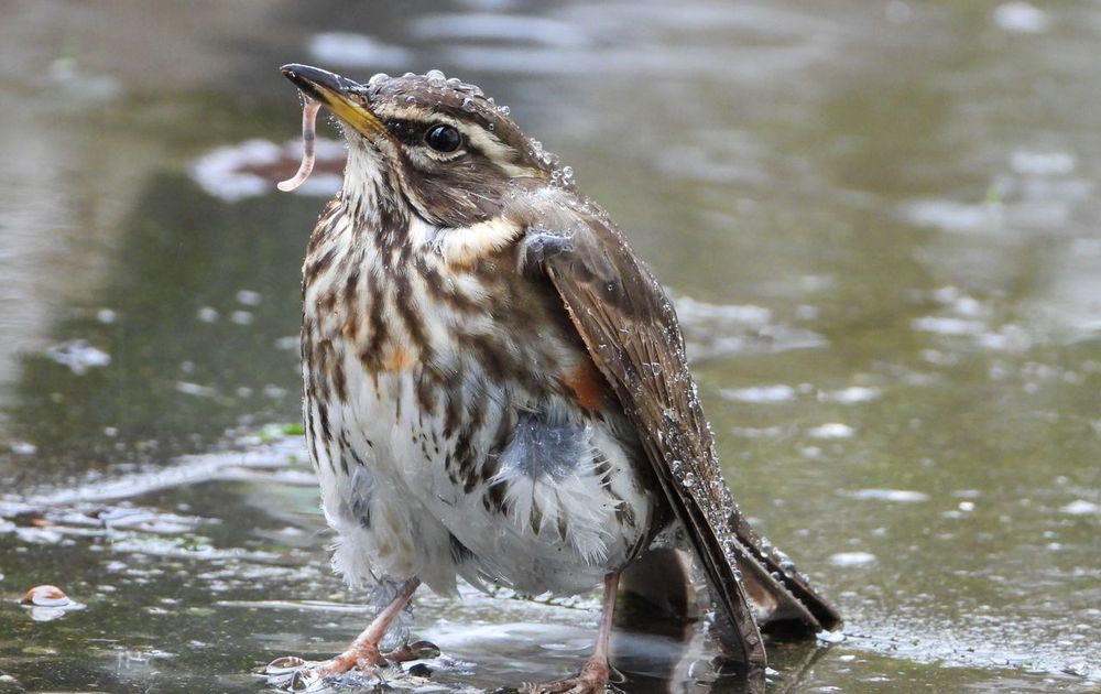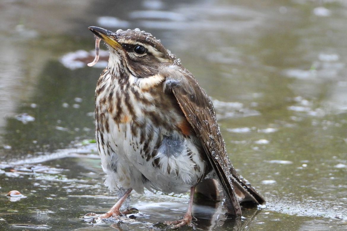 Koperwiek vloog tegen het raam en bleef eerst liggen, stond na enkele minuten weer op en heeft minutenlang met een regenwormpje in z'n snavel zitten bijkomen. Vloog daarna weer weg.