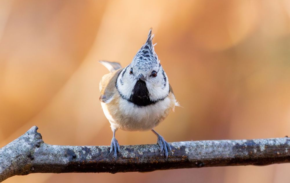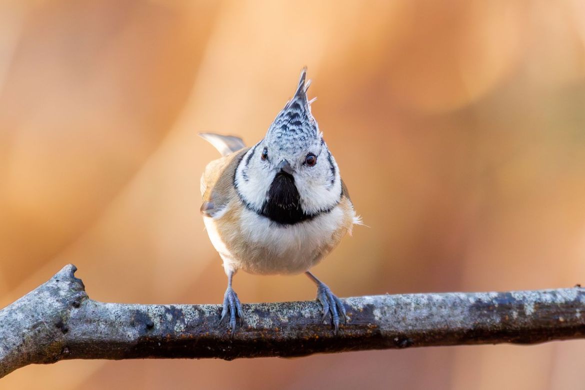 In het stadsbos bij Tilburg zijn vaak kuifmezen te vinden in de toppen van naaldbomen. Deze kuifmees maakte gelukkig een uitstapje en kon ik zo mooi fotograferen met een achtergrond van herfstige bladeren.