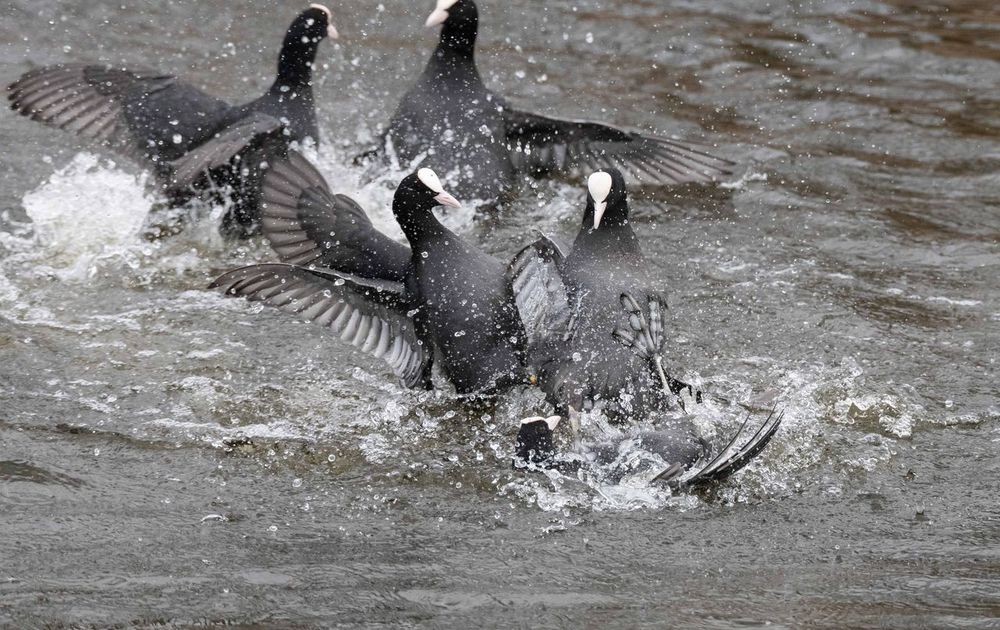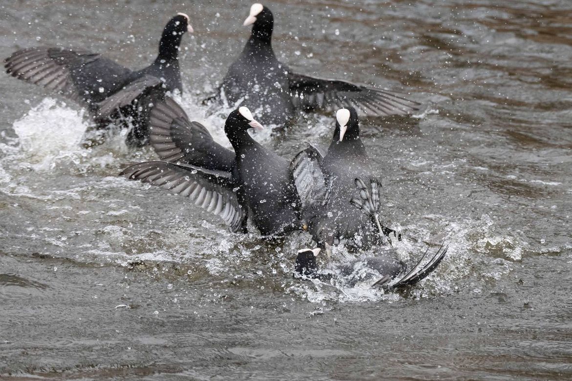 Tijdens een fietstochtje zag ik meerdere meerkoeten in gevecht. Zij stoorden zich totaal niet aan mij en vielen elkaar steeds opnieuw aan. Het ging er hardhandig aan toe.