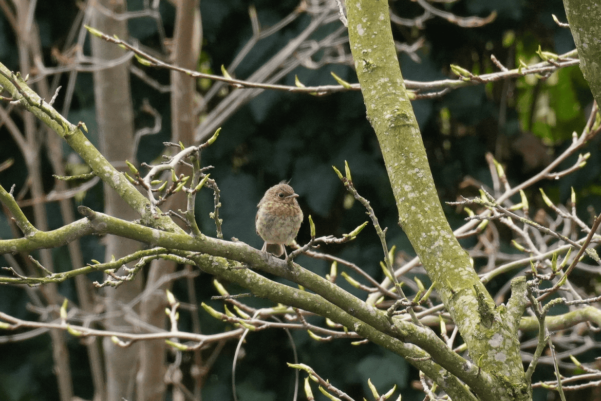 Wat vroeg! Er zat sinds februari een roodborst te broeden in de carport van de overburen, en eind maart zat er plots een pas uitgevlogen jong te piepen in de boom.
