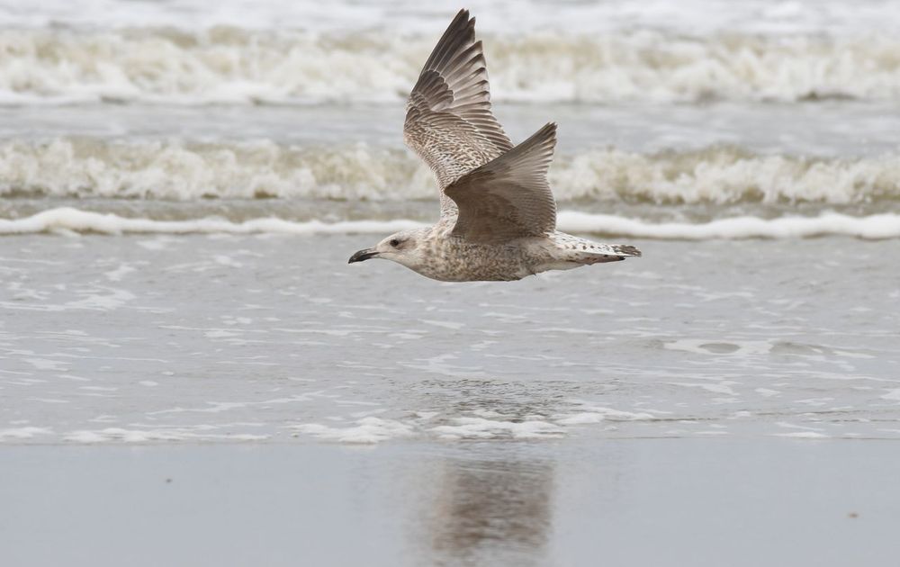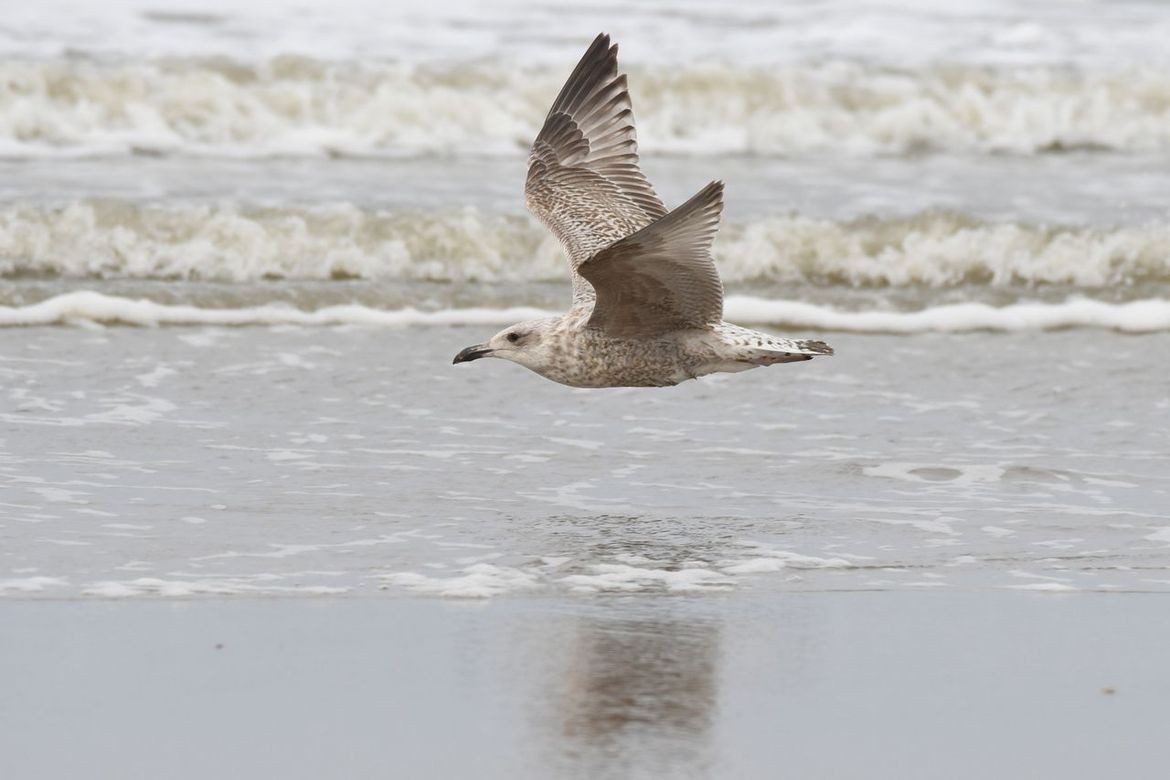 Een jonge zilvermeeuw vliegt laag boven de branding.