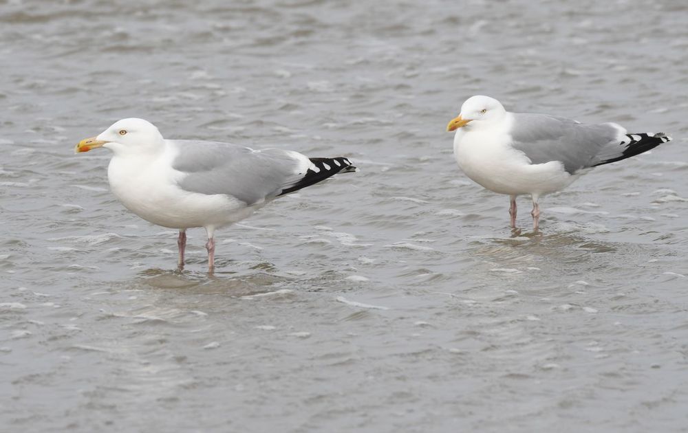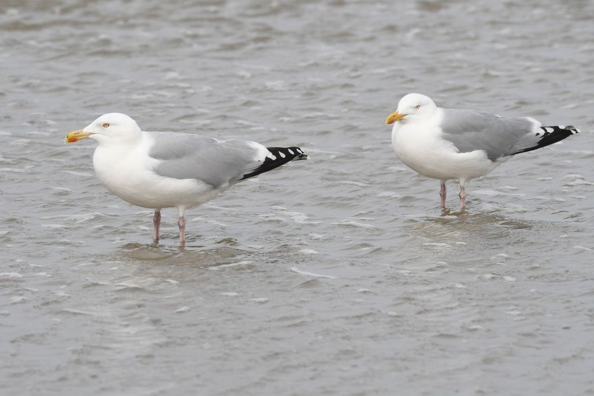 Een tweetal zilvermeeuwen staan in het water op de grens van strand en zee.