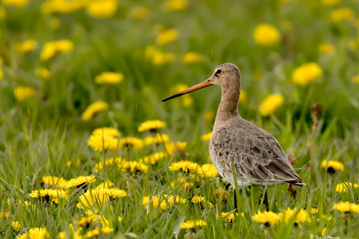 Grutto's waren druk aan het foerageren. De wei stond vol paardenbloemen. Vond dit wel een mooie combinatie